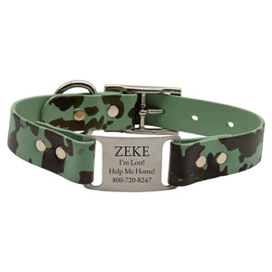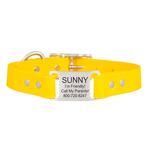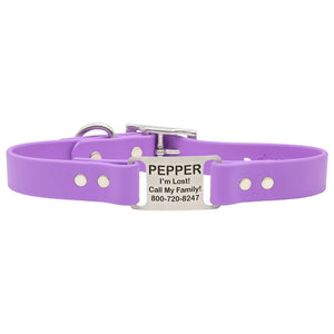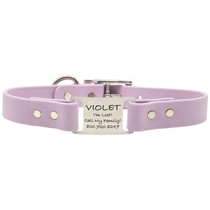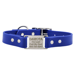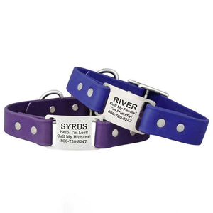 Even if your dog pulls when on the leash, this collar can take the abuse in stride. It's made of ridiculously durable poly-coated webbing that was originally developed for horse team reins and harnesses. Our personalized dog collars are waterproof and will hold up to all sorts of adventures! Don't let its soft feel and plush look fool you.